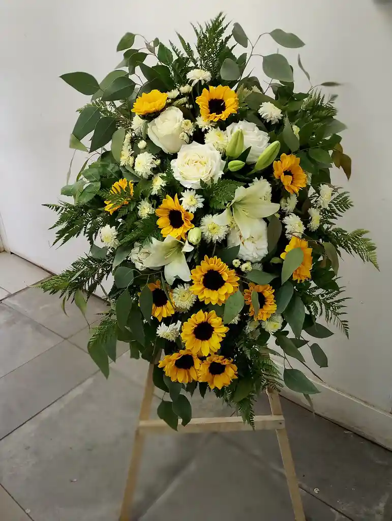 Delicada corona fúnebre para despedir a un ser querido Incluye : - Atril de madera -Tarjetita de Condolencia - Las flores pueden varias según disponibilidad - Hacer su pedido programado 2 horas anticipación