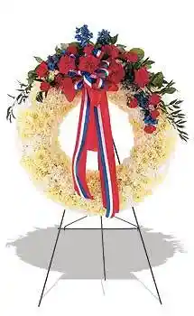 Elegante Corona Fúnebre Medidas Aproximadas: 60cm * 60 cm. Incluye Atril. Cinta Disponible: Blanca.