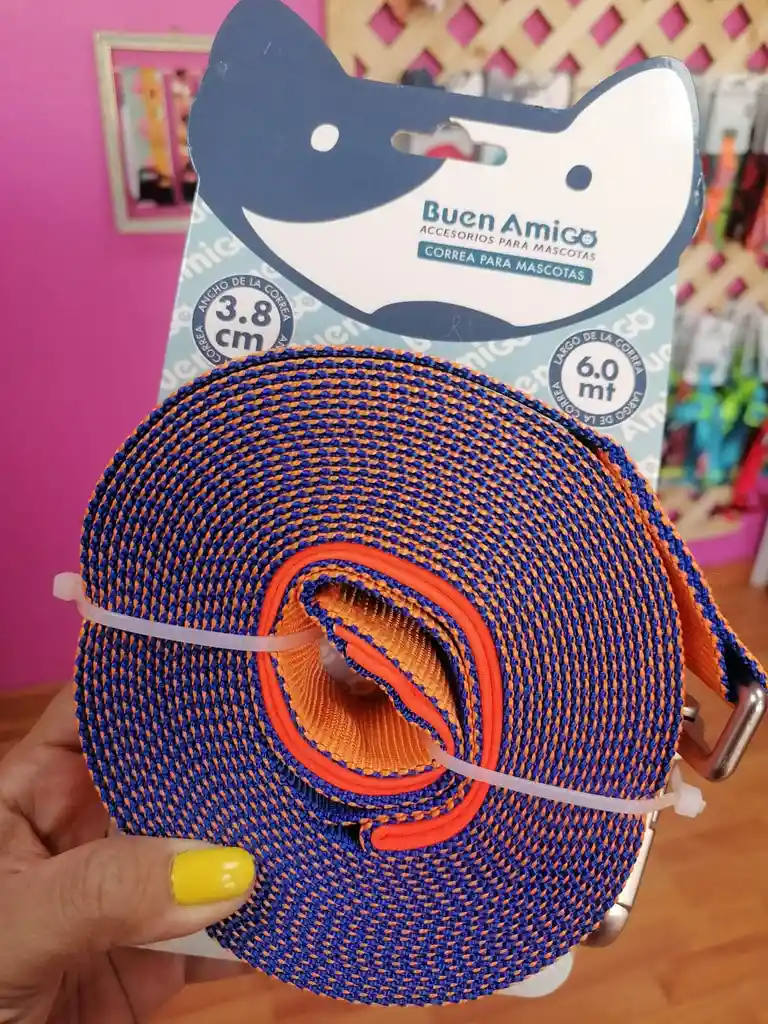 Las correas largas son ideales para entrenamiento o darle paseos con más libertad a las mascota. Principales Beneficios: – Mayor posibilidad de explorar y olfatear. – Mejor comunicación con sus pares. – Disminuye la frustración. – Sensación de semi-libertad. – Disminuyen los tirones por tener mayor libertad. – Disminuye el reflejo de oposición. Características: – Mango acolchado para amortiguar tirones – Mosquetón giratorio para evitar enredos. Especificaciones – Para perros de hasta 40 kilos. – Material: Poliester. – Ancho: 3.8 cm. Color sujeto a stock según disponibilidad