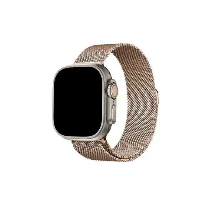 Correa Apple Watch Acero Inoxidable Magnética - Color Oro Rosa Cambia el diseño de tu Apple Watch con esta correa con estilo y moderna, elaborada con acero inoxidable con una capa adicional de deposición física de vapor (PVD) que le da al acero de grafito su acabado distintivo, que mejora la comodidad y durabilidad de la correa. Una interpretación moderna de un diseño desarrollado en Milan a finales del siglo XIX. Tejida en máquinas italianas especializadas, la suave malla de acero inoxidable se envuelve con fluidez alrededor de su muñeca, y debido a que es completamente magnética, es infinitamente ajustable, lo que garantiza un ajuste perfecto. De muy fácil instalación, la correa se instala en un abrir y cerrar de ojos gracias a su sistema de enganche mediante pestañas. Ideal para cambiar de aires y no caer en la rutina, aunque seguramente la llevarás todos los días. CARACTERISTICAS: Diseño único Completamente de acero inoxidable Aspecto moderno Material de alta resistencia Fácil de poner y quitar DISPONIBLE EN: 42 MM Serie 1 / 2 / 3 44 / 45 / 46 MM 49 MM Ultra NO COMPATIBLE CON 42 MM SERIE 10 Apple Watch Serie 1 / 2 / 3 / 4 / 5 / 6 / 7 / 8 / 9 / 10 / SE / Ultra