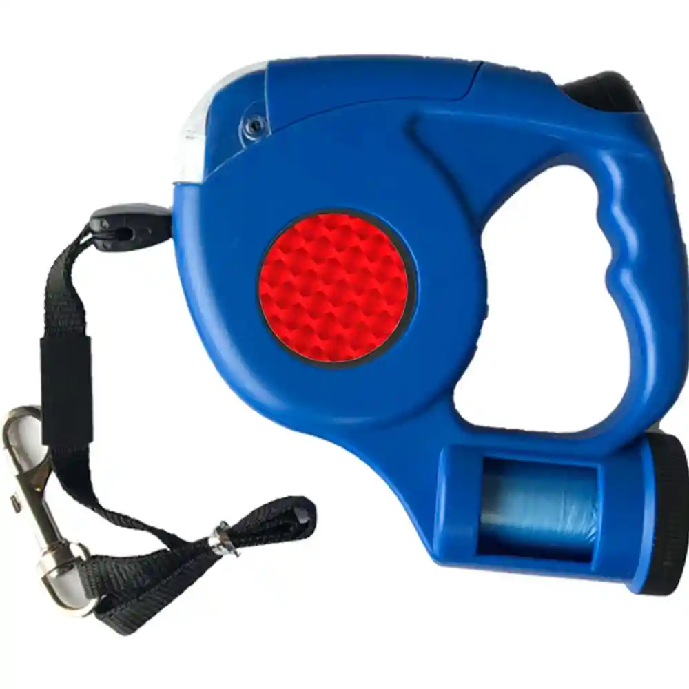 Correa retráctil para perro 3 en 1 dispensador de bolsas de basura, linterna LED correa para perro 5mts de longitud Material de correa duradero, la correa retráctil de 5mts de longitud incorporada en nailon fuerte, que coincidirá con los tamaños de sus mascotas de hasta 10 kg Sistema Simple de freno y desbloqueo, solo un clic puedes detener y liberar a tus mascotas, es fácil y conveniente mantener a tu perro bajo control. Función 3 en 1, la luz LED te proporciona una caminata nocturna iluminada, mejor y más segura, un dispensador de bolsas (bolsa de plástico gratis) que te permite limpiar rápidamente. Mango cómodo, diseño de mango ergonómico grande, es muy ligero y cabe en la mano correctamente. Diseño Superior, que resuelve el problema enredado, atorado o atascado. Especificaciones: Color: Amarillo, Azul, Negro, Rojo Longitud de la cuerda: 5 M Peso del perro adecuado: Hasta 10kg Alimentado por: 2 pilas AA (no incluidas)