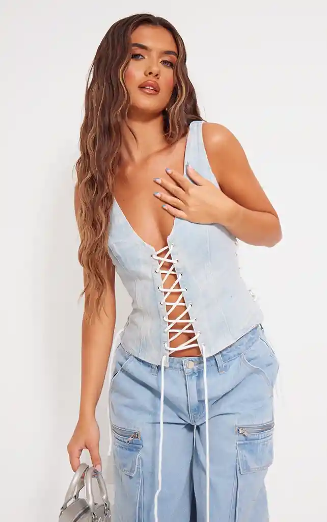 Corset Denim Celeste con Detalle de Cordones Frontales Impón estilo y confianza con este corset denim en tono celeste lavado, diseñado para realzar y definir la silueta. Su diseño sin mangas y escote pronunciado con cordones blancos al frente crea una figura femenina y audaz, perfecta para destacar en cualquier ocasión. Descripción del producto: El Corset Denim Celeste con Detalle de Cordones Frontales combina la fuerza del denim con la delicadeza de los detalles. Su estructura entallada resalta la figura, mientras que el cordón blanco aporta contraste y un toque moderno. Ideal para usar con pantalones de pierna ancha y flats tejidos, o para elevar el look con joyas doradas y un maquillaje natural de día. Atributos técnicos: • Color: celeste lavado • Material: denim resistente • Largo: corto tipo corset • Escote: pronunciado con cordones blancos • Corte: ajustado • Temporada: primavera-verano • Uso: casual chic, día, salida urbana