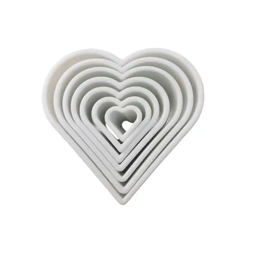 Molde para masas y/o galletas de plastico blanco en forma de corazon 7 piezas, tamaños desde 12x13x5cm de diametro.