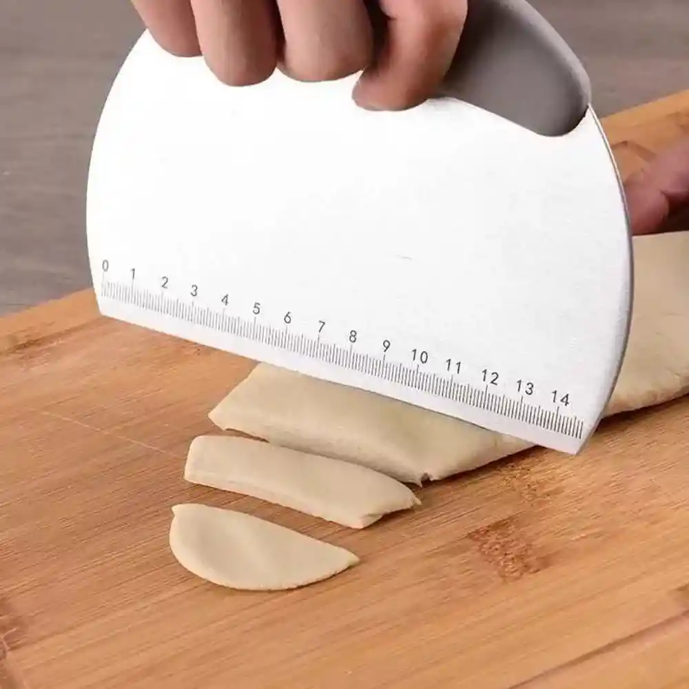 Scraper Para Masa Metálica Con Regla Utensilio multiusos de acero inoxidable, ideal para usar como cortador de masas, alisador para glasa, o recogedor. Perfecto para usar para picar o cortar verduras, frutas, hierbas y especias. Además, gracias a su superficie lisa sin juntas, es un alisador para glasa perfecto, como buttercream, icing, ganaché o chocolate. Ideal para cortar masas de pan, hojaldres, galletas… También sirve para utilizarlo como pala recogedora o espátula elevadora entre sus diferentes usos.