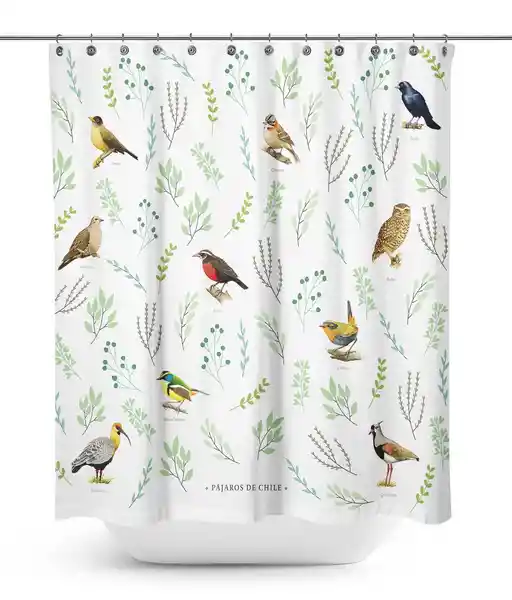 Cortina de Baño Con Una Selección de Ilustraciones de Pájaros Chilenos. el Diseño Incluye Los Siguientes Pájaros: Zorzal Chincol Tordo Tórtola Loica Búho Chucao Siete Colores Bandurria y Queltehue. Ideal Para Que Aprender a Distinguir Los Pájaros Más Comunes de Chile! Tamaño: 180 cm Por 180 cm. Material: 100% Polyester. Incluye 12 Ganchos Plásticos