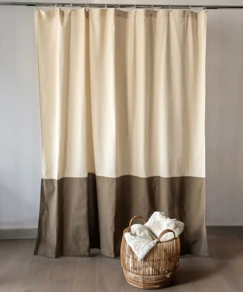 Cortina de baño bicolor. Tiene un tamaño de 180 x 180 cm.