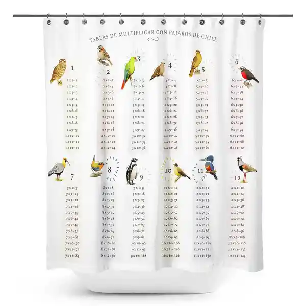 Cortina de Baño Con Diseño de Tablas de Multiplicar Del 1 al 12 Acompañadas de 12 Pájaros Chilenos. Incluye: 1 Cortina y 12 Ganchos Plásticos. Material: Poliéster Tamaño: 180 x 180 cm