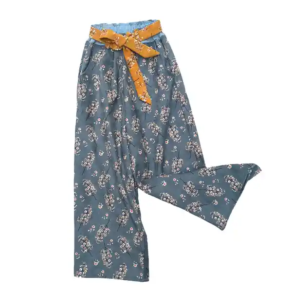 Pantalón Ancho de Cotelé Azul Estampado Con Florcitas Pretina De Algodón y Lazo de Cotelé Mostaza Floreado. Composición: Algodón y Poliéster. Hecho en Perú.