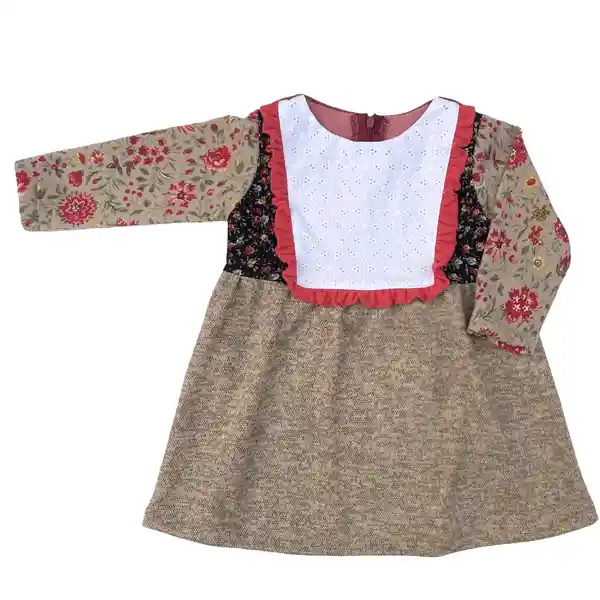 Vestido de Lanilla en Tonos Beige Rojo Y Negro Con Canesú Blanco Texturado y Vuelitos Color Sandía. Composición: Algodón y Poliéster. Hecho en Chile.