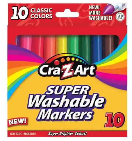 Los marcadores de línea ancha lavables clásicos de 10 unidades de Cra-Z-Art vienen en 10 colores variados, cada uno con una punta ancha y puntiaguda para colorear áreas grandes y detalles finos. No tóxico.