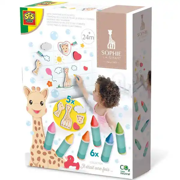 Con figuras de espuma firme de Sophie la jirafa Crea dibujos coloridos en la pared de azulejos Fácil de lavar durante el uso normal Fomenta la imaginación Diversión sin fin jugando en la bañera ¡Estas tizas son muy especiales! ¿Por qué? ¡Porque puedes llevarlos al baño! Tu pequeño tiene la garantía de pasar un baño divertido jugando con las figuras de espuma de Sophie y sus amigos. Las tizas se pueden utilizar para crear hermosas obras de arte en los azulejos del baño. Las figuras de espuma también se pueden pegar en la pared con un poco de agua. Una vez que haya terminado de jugar, simplemente puede enjuagar las baldosas con agua.