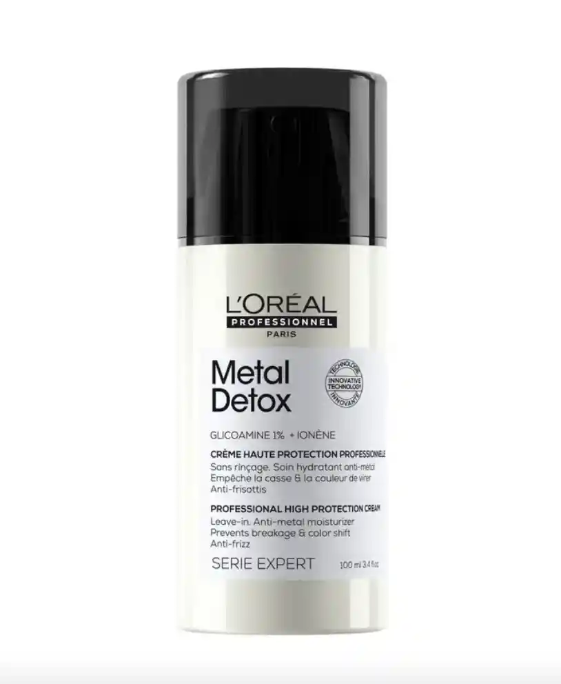 ¡¡Nuevo producto de la línea Metal Detox!! ¡Crema de peinar profesional de alta protección para evitar el quiebre del cabello y mantener el color perfecto, hasta tu próxima visita al salón! Metal Detox de Serie Expert, para detener el quiebre del cabello y mantener el color perfecto garantizando un cuidado profesional. Lavado tras lavado, partículas de metal, como el cobre, puede penetrar la fibra del cabello. Dichas partículas pueden crear riesgo de quiebre y cambios de color. Afectando negativamente los resultados del color, balayage y decoloración. El nivel de metal en el cabello varía, dependiendo de la porosidad del cabello y de la calidad del agua en el lugar donde vivimos. La crema de peinar de alta protección está concentrada con 1% de glicoamina, esta crema sin enjuague remueve el metal* del cabello y lo protege del depósito de nuevas partículas, para detener el quiebre y los cambios de color. La crema de peinar está formulada con filtros UV, protegiendo el cabello de los daños inducidos por los rayos UV y la oxidación, el cepillado y el calor hasta 230°C**, su textura fluida permite que se absorba instantáneamente en el cabello y recubra la fibra sin apelmazar. El cabello queda instantáneamente más manejable, más fácil de peinar y con un aspecto más saludable. Esta fórmula profesional es utilizada y aprobada por peluqueros, forma parte de su tratamiento en los salones de L'Oréal Professionnel Paris de todo el mundo. Beneficios: 72h de hidratación y control del frizz** 3 veces más definición**. Conservación del 97 % del brillo del color después de 8 semanas** El cabello es intensamente hidratado, fortalecido y más manejable. Suavidad duradera. 72h de suavidad* Protección contra el calor (230 °C/450 °F) rayos UV. * Test instrumental después de 10 aplicaciones. **Test instrumental en crema de alta protección Metal Detox *** Test instrumental en shampoo + mascara Metal Detox **** Test instrumental en aceite concentrado Metal Detox Modo de Uso: Aplicar de 1 a 4 presiones en el cabello húmedo o secado con toalla y distribuye de manera uniforme de medios a puntas. Proceda a secar con secador o al aire.