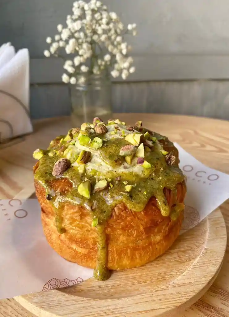 El croissant de pistacho de Saoco se caracteriza por su textura crujiente. Está relleno y cubierto con crema o mousseline de pistacho y trocitos de pistacho picado. Todos los componentes son de elaboración propia.