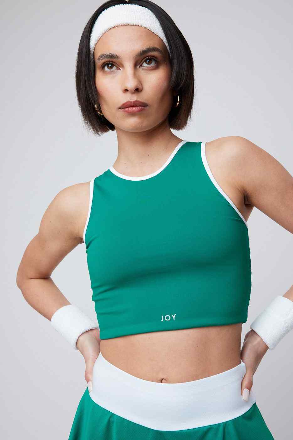 Top deportivo tipo halter. con detalles de color combinado en escote y sisa. Soporte medio/bajo. Tela gruesa y elástica que entrega mayor contención. Sin elástico interno en pretina. Forro en el delantero y trasero sin copa añadida. Terminación embolsada en largo y sin costura. Logo JOY ubicado en delantero inferior centrado