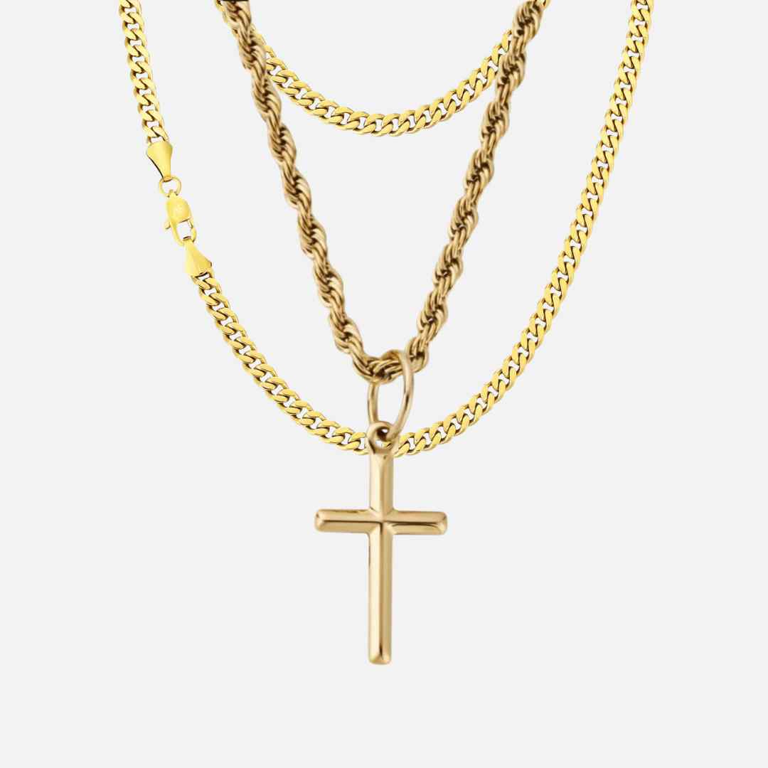 CARACTERÍSTICAS✓ Acero inoxidable 316L✓ Rodio✓ Resistente al agua, sudor y calor✓ Hipoalergénico (sin piel verde)✓ Enchapado Oro 14k y Oro 18k Incluye:- Cadena Miami Cuban Oro 5mm 50cm- Crucifix Pendant Oro + Cadena Rope 2.5mm Oro