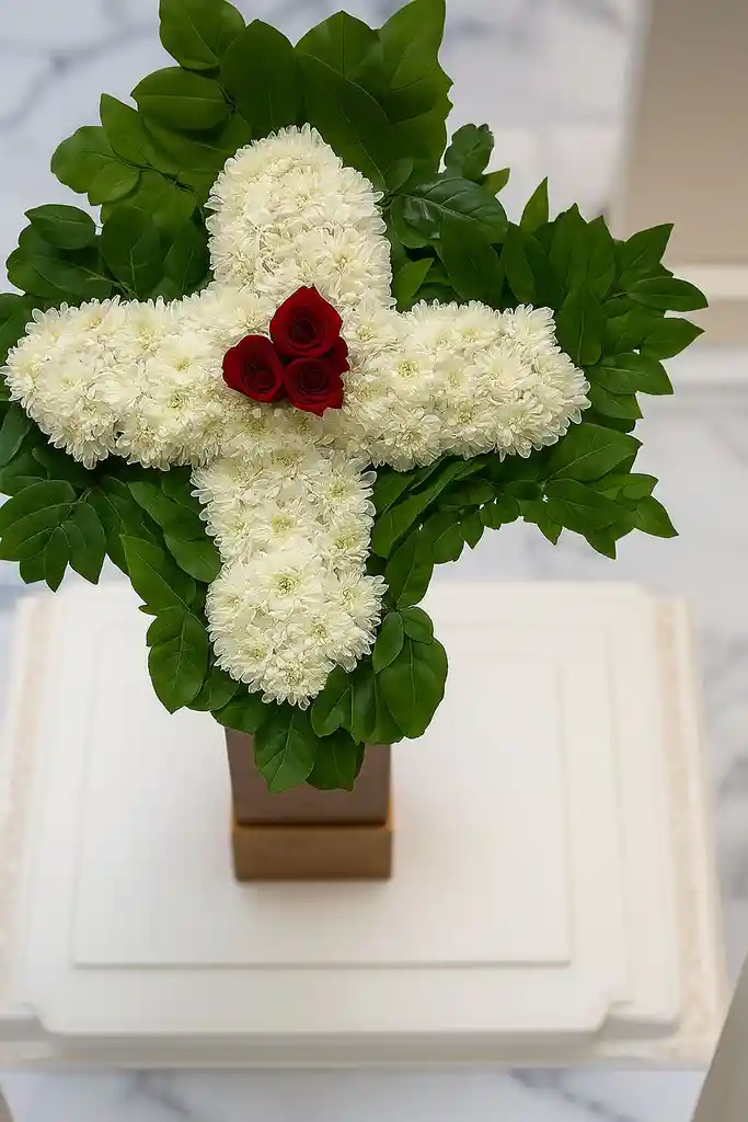 HERMOSA CRUZ PEQUEÑA FLORES BLNCAS PARA DESPEDIR A LAS PERSONAS QUE ESTIMAMOS