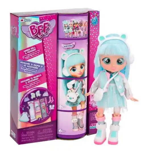 Conoce a la nueva BFF, Kristal! ¡Ahora tus personajes favoritos de los Bebés Llorones Lágrimas Mágicas se han hecho mayores! ¡Kristal viste con ropita de moda y incluye 9+ sorpresas! Tiene el pelo largo de nailon, ojos de cristal y el cuerpo articulado! La muñeca mide aproximadamente 20 cm de alto. Se recomienda de 3 años en adelante.