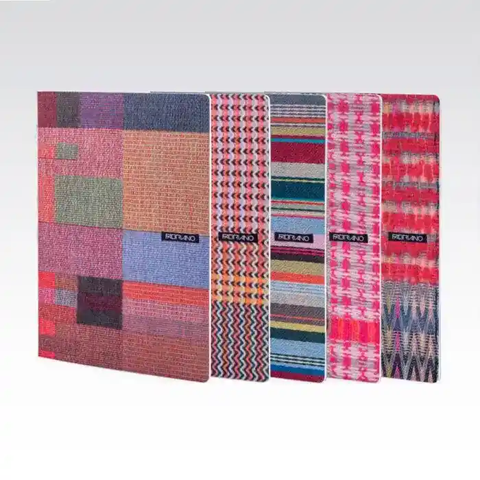 Los cuadernos están cosidos con hilo (color a juego con la portada) y la encuadernación es visible en la columna vertebral; se abre plano. La portada también está impresa en la parte posterior, replicando exactamente la parte posterior de un Fabrica textil. Las páginas están hechas de un papel ecológico con un tono marfil relajante.