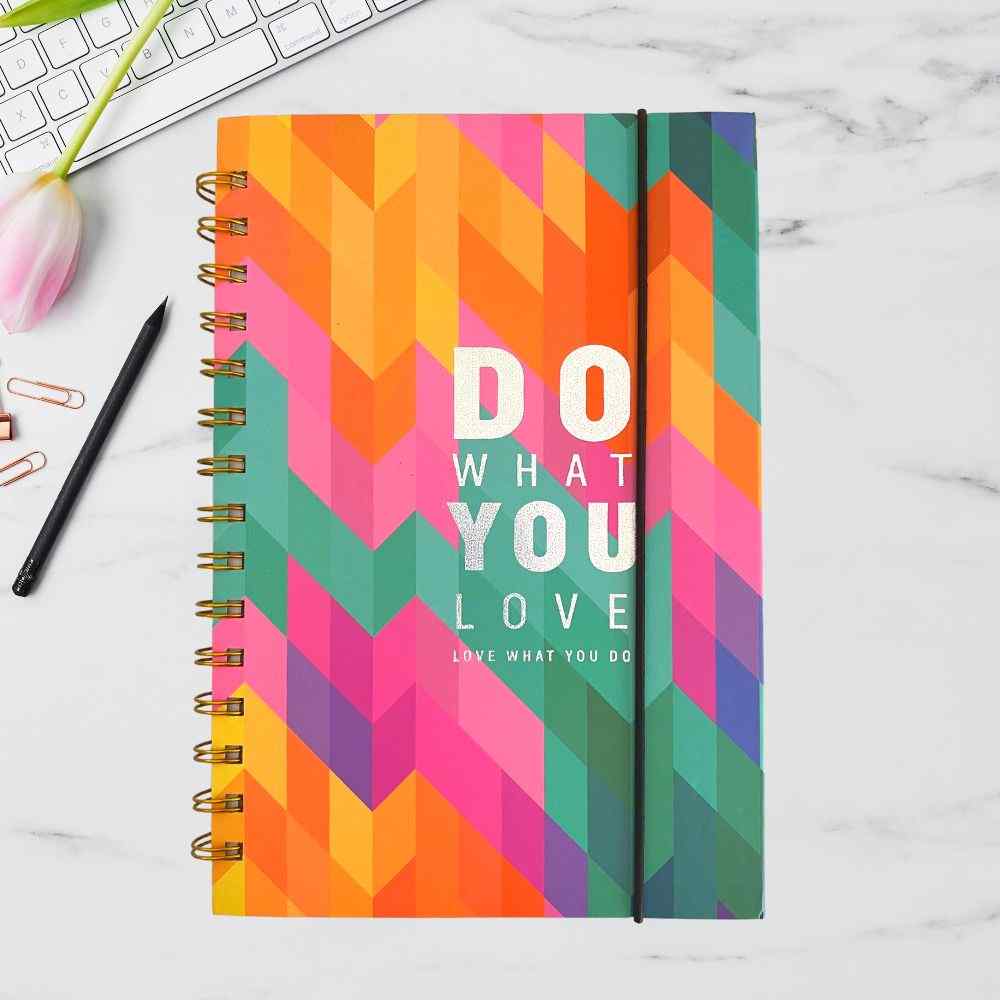 Cuaderno grande con un precioso diseño y frase "Do what you love, Love what you do" (Haz lo que amas, Ama lo que haces) con espiral y con un práctico elástico.Lindísimo diseño estilo arcoiris con alegres colores.Características:120 hojas rayadasTamaño: 21 x 15 cms.Preparamos cada producto Karmas en un precioso packaging con cintas de colores y lleno de detalles en su interior, para sorprender a tus más queridos o a ti misma.
