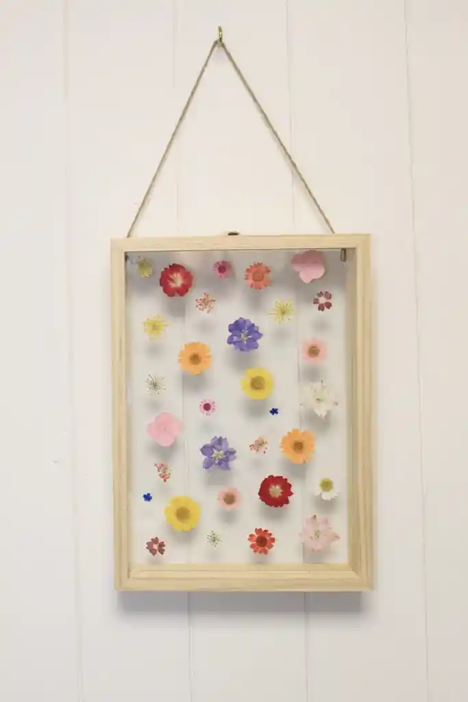 Cuadro de flores prensadas naturales entre vidrios en tonos rosados, blancos, amarillos, naranjos, rojos y azules. Incluye marco de madera. Ideal para decorar tu casa. Medidas: Altura 29.7 cms / Ancho 21 cms Por tratarse de un producto natural las tonalidades, tamaños y formas de las flores pueden variar. Nunca habrán dos cuadros exactamente iguales. Nuestros productos pueden durar varios años si se cuidan de la manera correcta no exponer al sol directo, cambios de temperaturas muy abruptos, exposición a espacios húmedos, contacto directo con el agua, inadecuada manipulación, entre otros.