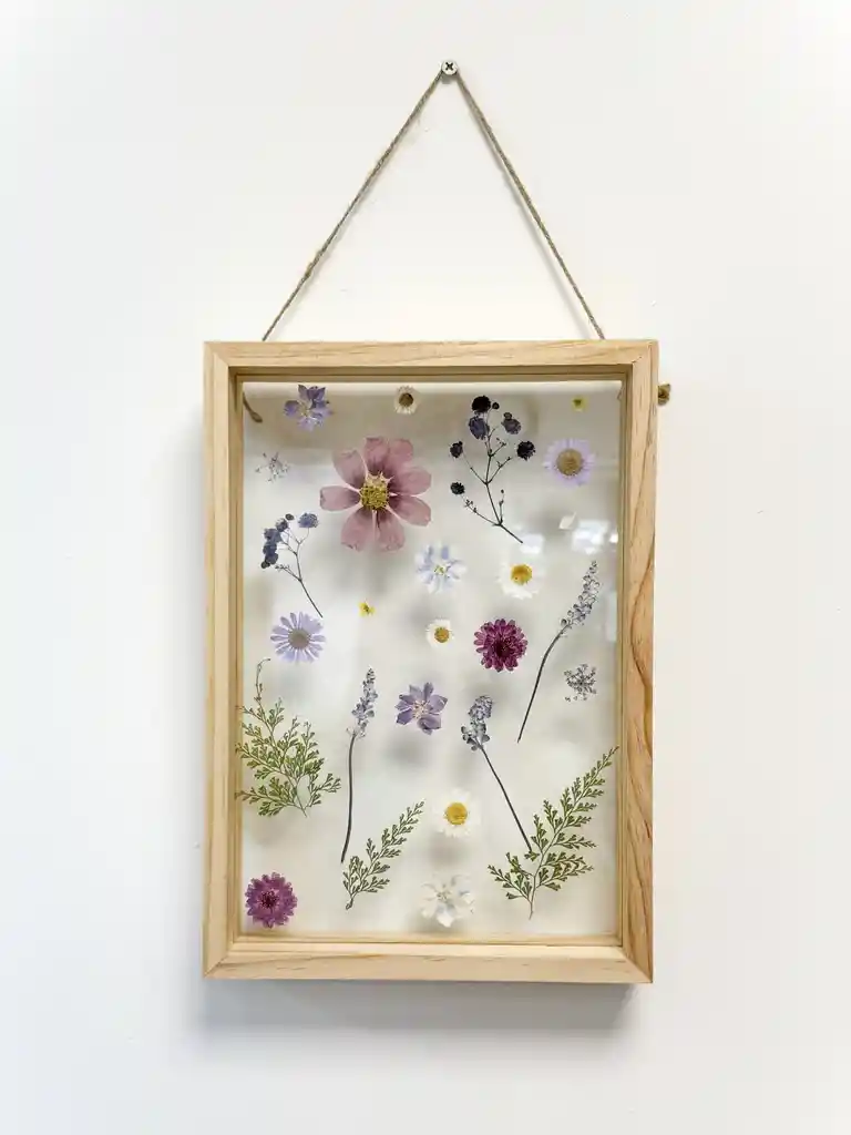 Cuadro de flores prensadas naturales entre vidrios en tonos morados, lilas y verdes. Incluye marco de madera. Ideal para decorar tu casa. Medidas: Altura 29.7 cms / Ancho 21 cms Por tratarse de un producto natural las tonalidades, tamaños y formas de las flores pueden variar. Nunca habrán dos cuadros exactamente iguales. Nuestros productos pueden durar varios años si se cuidan de la manera correcta; no exponer al sol directo, cambios de temperaturas muy abruptos, exposición a espacios húmedos, contacto directo con el agua, inadecuada manipulación, entre otros.
