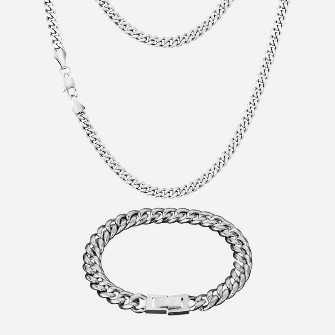 CARACTERÍSTICAS✓ Acero inoxidable 316L✓ Rodio✓ Resistente al agua, sudor y calor✓ Hipoalergénico (sin piel verde)Incluye:- Cadena Miami Cuban 5mm de 50/55/60 CM.- Pulsera Cuban 8mm de 20CM.