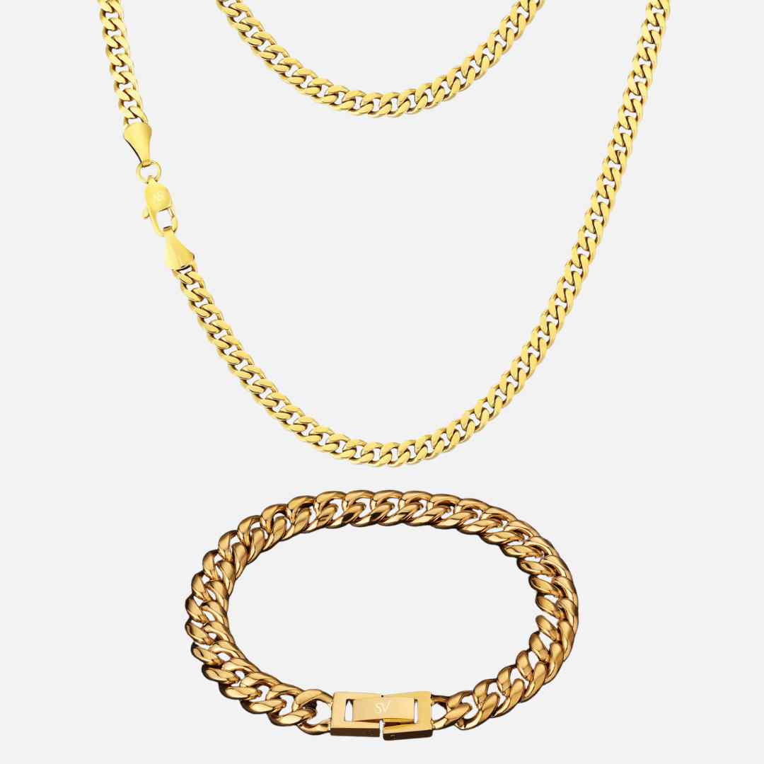 CARACTERÍSTICAS✓ Acero inoxidable 316L✓ Enchapado de Oro 14k 2.5 micras✓ Rodio✓ Resistente al agua, sudor y calor✓ Hipoalergénico (sin piel verde)Incluye:- Cadena Miami Cuban Oro 5mm de 50/55/60 CM.- Pulsera Cuban Oro 8mm de 20CM.