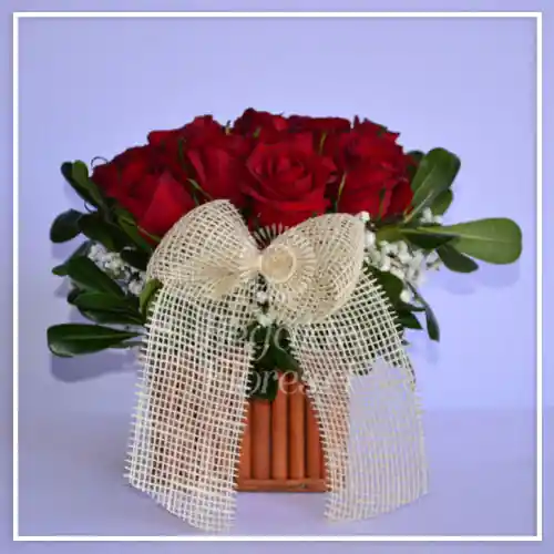 Hermoso arreglo floral de rosas ecuatorianas rojas en base de madera y cinta. Rosas de color Rojo ideal para el Amor