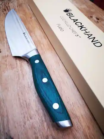 Cuchillo BlackHand Modelo "Puelo". 8 pulgadas en acero alemán genuino 1.4116. Mango especial ergonómico de diseño color verde de Pakawook. El cuchillo BlackHand® modelo Puelo está fabricado con acero inoxidable alemán 1.4116, lo que le da una gran dureza y filo excepcional. Indicado para chefs que buscan un cuchillo eficaz, pero cómodo y versátil para todo tipo de preparaciones.