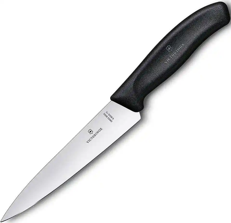 Su herramienta multifunción para la cocina de uso diario. Cuchillo de cocina hecho en Suiza de corte recto. De filo súper afilado y mango ergonómico. Alto (cms): 2,25 Ancho (cms): 9,30 Largo (cms): 37,50 Colección: Swiss classic Material Del Mango: Elastómeros termoplásticos Tipo De Filo: Normal recto Apta Para Lavavajillas: Si Longitud De La Hoja (Cm): 15 Peso (gr): 144