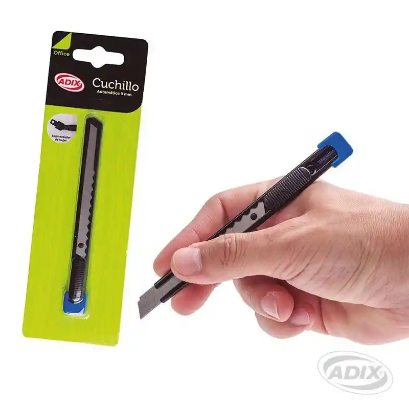Cuchillo cartonero de 9 mm con seguro automático. Color negro en blister Cuchillo cartonero metálico, hoja de 9 mm, color negro en blister. Con sistema de cierre de seguridad automático y segmentador de hojas. Para cortar papel, cartón, plásticos, etc. Incluye hoja de repuesto. Medidas 12,1 x 1 cm aproximadamente. Producto no apto para niños menores de 3 años.