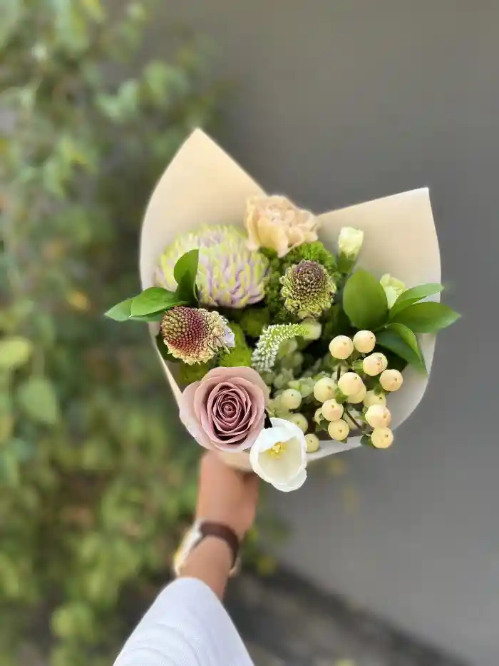 Cucurucho incluye un mix de 12 varas de flores frescas más follaje en tonos nudes, blancos, cafés, damascos y/o rosados pasteles con un toque de follajes del día envuelto en papel del día.