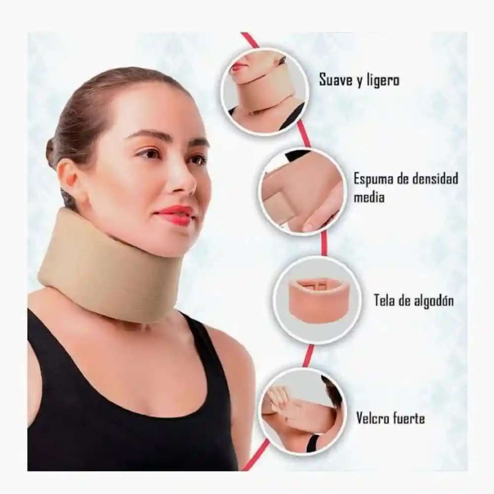 • Cuello o collar cervical blando, anatómico, ajustable con velcro. • Cómodo, liviano y lavable. • Uso en pacientes con trauma en alguna vértebra de la columna cervical, ayuda en patologías como tortícolis, síndrome vertiginoso o pequeños esguinces cervicales, espondilitis cervical, espondilosis cervical, lesiones por extensión del cuello, artritis reumatoide, osteoartritis, hernia discal.