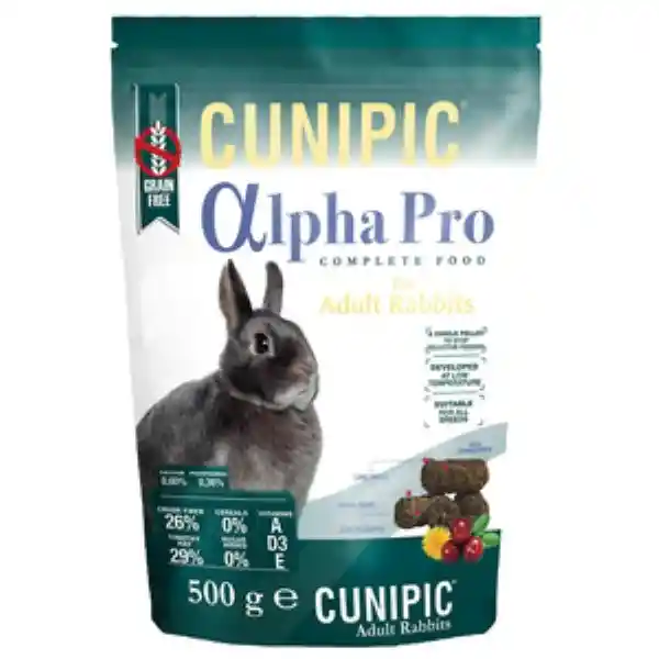 Cunipic Alpha Pro Conejo Adulto es un Pienso Para Conejos Adultos Basado en el Sistema de Alimentación All in One Que Significa Que en Cada Croqueta Están Todos Los Ingredientes Necesarios Para Que tu Mascota Esté Sana y Feliz Evitando Las Carencias Alimenticias Por Selección de Alimentos. Cada Gránulo de Comida Contiene Una Mezcla Homogénea de Todos Los Nutrientes Que Necesita el Animal y Con Esto se Consigue Que no Seleccione Los Ingredientes Que le Gustan Dejando Apartados Otros. Una Única Croqueta Contiene Todos Los Nutrientes Evitando la Selección. Sin Cereales Para Que Mantenga un Peso Saludable y Sin Azúcares Añadidos Previniendo la Obesidad. Mantiene Las Fibras Largas Para Favorecer el Desgaste Dental. Tiene Una Extraordinaria Palatabilidad Que Garantiza Que le Guste. Buena Conservación Gracias a su Auto Cierre Que lo Mantiene Fresco Más Tiempo.