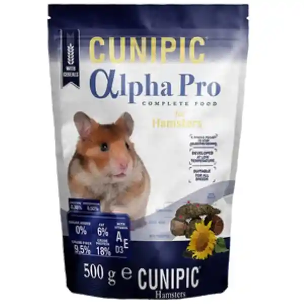 Cunipic Alpha Pro es un Pienso Completo Para Hámster Sano Delicioso y 100% Equilibrado en Cada Croqueta. Basado en el Sistema de Alimentación All in One Por el Cual Cada Croqueta Contiene Todos Los Nutrientes Vitaminas Minerales y Fibra Necesarios Para Que tu Mascota Esté Sana y Feliz Evitando Las Carencias Alimenticias Que Sufren a Veces Por la Selección de Los Alimentos. Cada Gránulo de Comida Contiene Una Mezcla Homogénea de Todos Los Nutrientes Vitaminas Minerales y Fibra Que Necesita tu Hámster Así no Podrá Elegir Unos Alimentos y Dejar Otros en el Plato Perdiendo Los Nutrientes de Los Que no se Come. Una Única Croqueta Contiene Todos Los Nutrientes Evitando la Selección. Sin Cereales Para Que Mantenga un Peso Saludable y Sin Azúcares Añadidos Previniendo la Obesidad. Mantiene Las Fibras Largas Para Favorecer el Desgaste Dental. Tiene Una Extraordinaria Palatabilidad Que Garantiza Que le Guste. Buena Conservación Gracias a su Auto-Cierre Que lo Mantiene Fresco Más Tiempo.