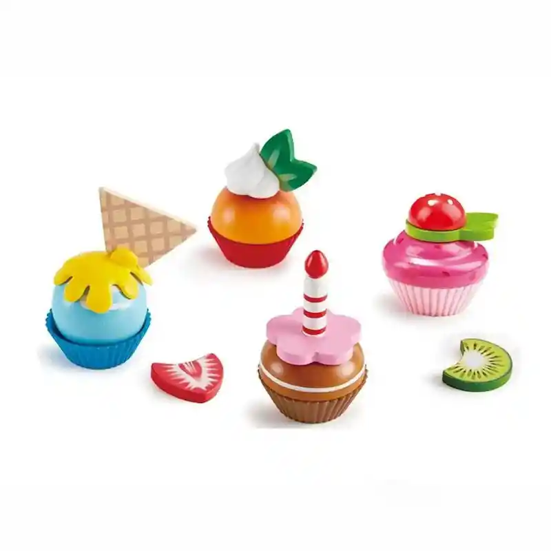Set de madera que desarrolla la imaginación y creatividad en los niños al incentivarlos a realizar sus propias creaciones de cupcakes. Contiene cuatro cupcakes, una gama de aderezos espectaculares, una vela, frutas y una oblea. Es el complemento ideal para tu cocina hape.