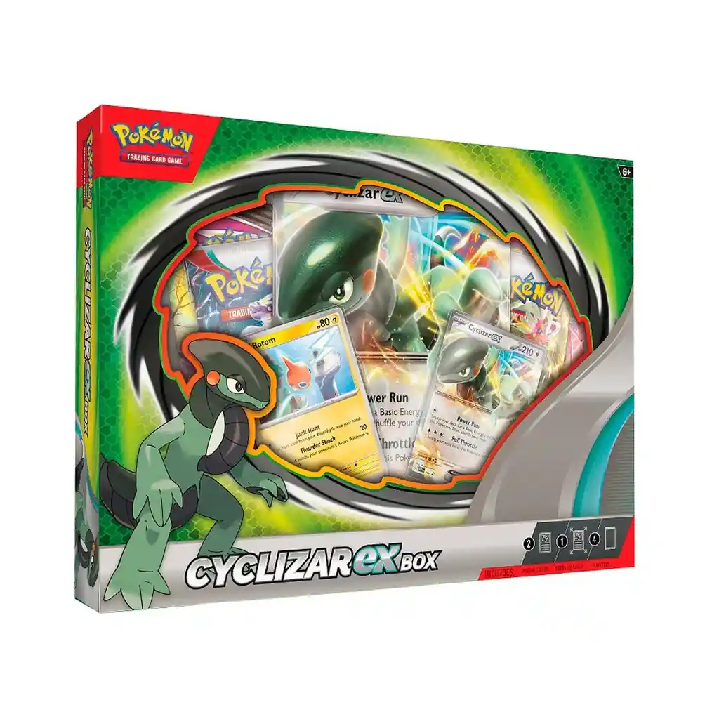 La colección Cyclizar ex de JCC Pokémon contiene:• 1 carta holográfica de promoción de Cyclizar ex• 1 carta holográfica de Rotom• 1 carta holográfica de gran tamaño de Cyclizar ex• 4 paquetes de mejora de JCC Pokémon• 1 carta con código para JCC Pokémon Live"