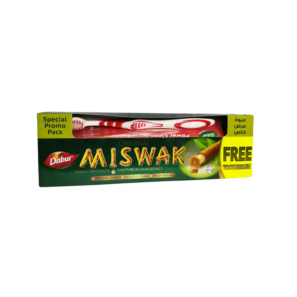 La pasta de dientes Dabur Miswak con Pure Al Arak o Miswak ayuda a eliminar la placa y mejora la salud bucal interproximal. El extracto Natural de Al Arak reduce las caries y combate la placa. Formulado con extractos puros de Miswak o Al Arak proporciona un aliento fresco al instante y garantiza unas encías sanas. El extracto de Al Arak ayuda a fortalecer el esmalte de los dientes y deja una boca sana. También evita que empeore cualquier caries existente. Está libre de fluoruro y productos químicos nocivos. La pasta de dientes Dabur Miswak Gold Total Care viene con un cepillo de dientes como complemento.