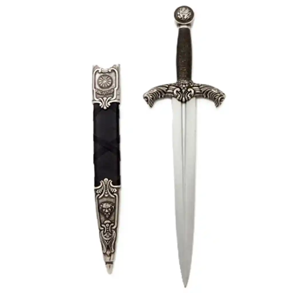 DAGA REY ARTURO 44CM 4139NQ Reproduccion de la mitica Daga del Rey Arturo Daga llamada Carnwennan Marca Denix Modelo 4139 NQ Material Metal Zanak y plastico negro forrado Color niquel negro Reproduccion para exhibición (no es producto de practica, no tiene filo ni es fulltang) Diseñada especialmente para hacer juego con Excalibur Medida 44 centímetros Peso 915 gramos Fabricada en España Las armas más famosas del Rey Arturo son la espada Excalibur y la lanza Rhongomiant. Además, se le atribuyen otras armas como la espada Clarent y la daga Carnwennan. Excalibur: Es quizás la arma más emblemática de Arturo, conocida por su poder y misticismo. Se dice que fue forjada por fuerzas sobrenaturales y entregada por la Dama del Lago, o que fue la espada que Arturo sacó de la piedra. La vaina de Excalibur tenía la propiedad de proteger a su portador de heridas. Rhongomiant: También conocida como "Ron", esta lanza es mencionada en algunas versiones de la leyenda artúrica como otra de las armas de Arturo. Clarent: Esta espada se describe como la "espada de paz" del Rey Arturo, utilizada en momentos de menor conflicto o ceremonial. Carnwennan: Se trata de una daga que también forma parte del arsenal de Arturo.