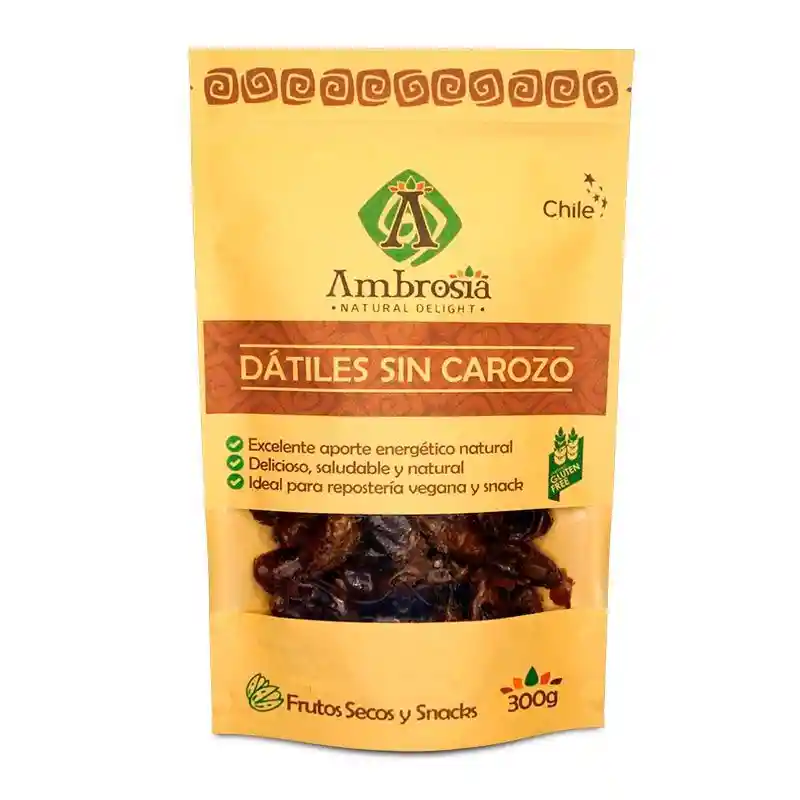 Ingredientes: Dátiles sin Carozo Peso: 300g. Certificación: libre de gluten Otras necesidades: vegano, sin conservantes, ni mezclas de otros subproductos Duración: consumir dentro de 12 meses a partir de la fecha de elaboración Formato: doypack con zipper, etiquetada con información nutricional, Res. sanitaria y una atractiva presentación Un Verdadero Manjar Este fruto otoñal, procedente de la palmera datilera originaria de Mesopotamia y cuyo cultivo se inició hace más de 50.000 años, se suele tomar desecado y debido a su dulce sabor ha ido ganando adeptos con el paso del tiempo. Y no es para menos, pues las propiedades nutricionales que acompañan a su composición son de lo más ricas y variadas. Por ejemplo, los dátiles son una gran fuente de fibra, minerales como el potasio, el magnesio y el calcio, carbohidratos saludables y vitaminas A, C y E, además de numerosos antioxidantes. ¿Qué beneficios aportan dichos compuestos a nuestra salud? Puedes tomar los dátiles como cualquier otra fruta, en solitario y a modo de postre, aunque su dulzor también es perfecto para sustituir el azúcar en algunas elaboraciones o para combinar con otros ingredientes salados que proporcionen a tu paladar un suculento contraste. En cuanto a su papel en tu estado de salud, ¿qué propiedades puede aportarte? Una de sus cualidades más conocidas es la de aliviar y prevenir el estreñimiento debido a la fibra dietética que incluye en su composición. Aunque para sacarles el máximo partido lo mejor es que los tengas en remojo durante toda una noche antes de su consumo. Los dátiles no tienen colesterol y poseen muy poca grasa, por lo que son ideales para regular los niveles de colesterol malo y reducir el riesgo de desarrollar enfermedades del corazón. La vitamina A de este fruto se convertirá en el mejor aliado de las personas mayores que tienen problemas de visión o padecen ceguera nocturna, pues es capaz de mejorar ambas afecciones. Lo mismo ocurre con el calcio y el fortalecimiento de los huesos, pues ayuda igualmente a combatir enfermedades como la osteoporosis. Debido a su influencia en el sistema nervioso y la presencia de ácido pantoténico, conocido también como vitamina B5, el consumo de uno o dos dátiles al día puede prevenir alteraciones como el estrés, la ansiedad o la depresión leve. Diversos estudios aseguran que los dátiles pueden enriquecer funciones cognitivas como la memoria, la atención o la concentración, así como prevenir los accidentes cerebro vasculares. Las vitaminas del grupo B y el triptófano que poseen fomentan la formación de melatonina y facilitan el sueño nocturno, convirtiéndose en un arma de lo más eficaz contra el insomnio.