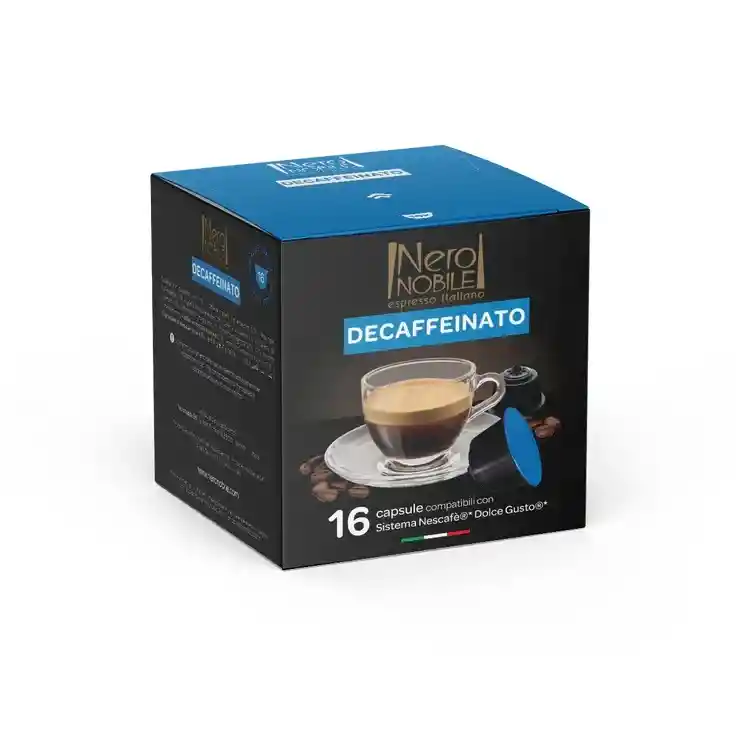 Mantiene intacta la intensidad aromática, las notas aromáticas en nariz y el retrogusto duradero, gracias al delicado proceso de descafeinado. Cápsulas compatibles con sistema Dolce Gusto. Intensidad nivel 9/13. Rendimiento óptimo 50ml (2/7). 16 cápsulas por caja. Información nutricional cada 100g: Energía (kcal): 344 - Grasa 8,3g total - Grasa saturada: 3,7g - Carbohidratos totales 31,4g - Azucares: 0,7g - Proteinas: 15,8g Sales: 0,1g
