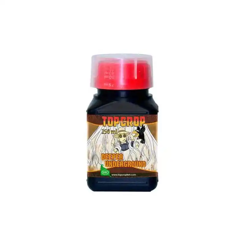 Deeper Underground de Top Crop es un fertilizante líquido formulado para la estimulación del crecimiento y del desarrollo de las raíces de las plantas. Con el uso de Deeper Underground, una vez por semana como mínimo según riegos, aumentarás notablemente el número de pelos radiculares. Al igual que muchos más beneficios que te explicamos a continuación. La composición de Deeper Underground permite su uso desde los primeros días de vida desde que es una plántula con resultados casi inmediatos. CÓMO USAR DEEPER UNDERGROUND DE TOP CROP: Empieza siempre por la dosis mínima que se indica en la etiqueta del producto. En este caso, la dosis inicial es 1ml por 1L de agua, únicamente se debe usar Deeper Underground de Top Crop por irrigación. En el siguiente riego podrás aumentar la dosis, hasta los 2ml por 1L de agua. Siempre observa cómo tus plantas asimilan los nutrientes para considerar si es necesario subir a la dosis final (2ml). Deeper Underground de Top Crop reduce el estrés que padece la planta tras someterse a un trasplante, al igual que revitalizará las raíces dañadas durante este proceso. También elevará el contenido orgánico del terreno, mejorando la aireación del mismo. Recuerda que puedes ampliar su aplicación hasta principios de la floración. CONSEJOS Puedes combinar el uso de Deeper Underground con otros fertilizantes de Top Crop destinados a la fase de crecimiento y/o a las raíces, como puede ser Micro Vita. Agita bien el producto antes de cada uso. Te recomendamos que guardes este fertilizante en un lugar seco, evitando su exposición a la luz solar. Conservándolo así mantendrás la calidad del producto.