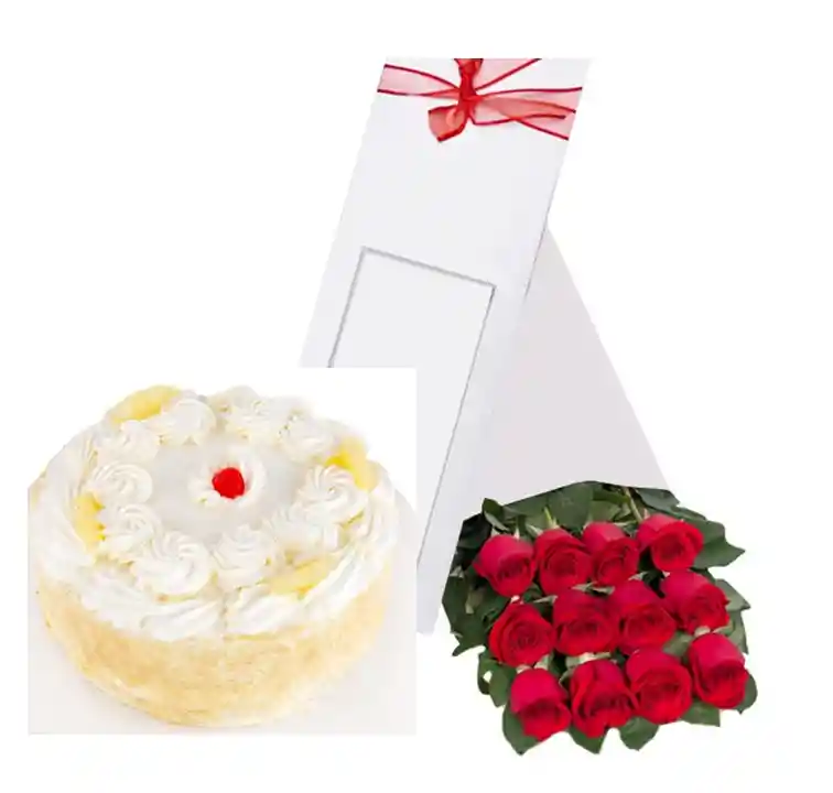 Caja con 12 Rosas Importadas más Torta del Dia para 15 Personas.