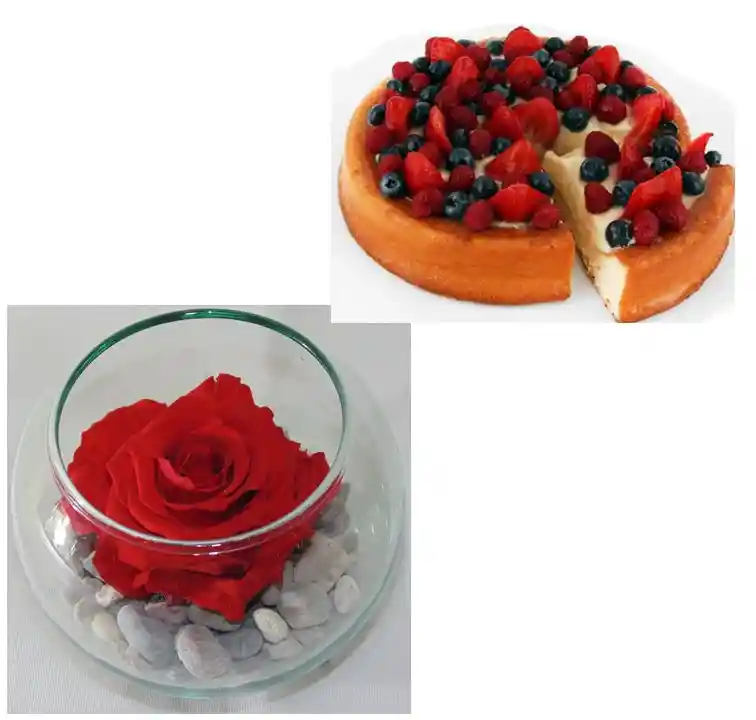 Hermosa Rosa Preservada en Pecera de Vidrio y y Tartaleta del Dia (Tartaleta de Frambuesa, Pie de Limon, Tartaleta de Frutas o Tartaleta Frutos del bosque) La Rosa Preservada tiene una duración de 03 años.