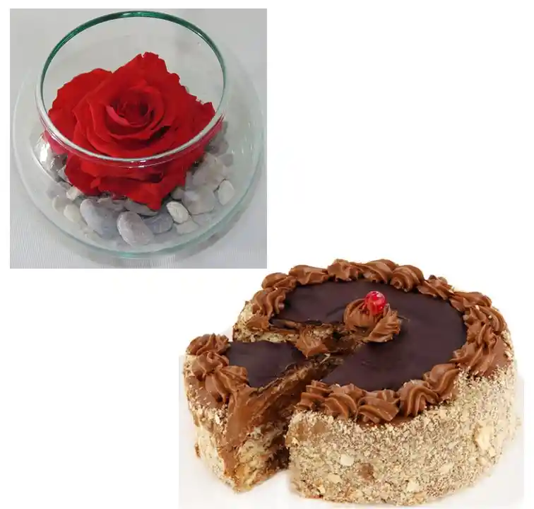 Hermosa Rosa Preservada en Pecera de Vidrio y Torta del Dia 15 personas (Piña, Chocolate, Selva Negra, Trufas, Hoja Manjar, tres Leches) La Rosa Preservada tiene una duración de 03 años.