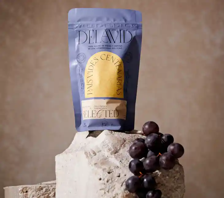 Delavid País – Superalimento de Uva Centenaria Polvo de uva fermentada de vides centenarias del Valle del Itata. Rico en antioxidantes, fibra y beneficios antiinflamatorios. Ideal para desayunos, batidos, infusiones y recetas. Delavid País Vides Centenarias es un superalimento en polvo, elaborado con orujo de uva fermentado de la cepa País, la más antigua del vino chileno. Su proceso sustentable y de deshidratación avanzada conserva antioxidantes y fibra dietaria de forma natural. 🍇 Antioxidantes naturales: 1.600 unidades ORAC por porción (5 g), protegen del estrés oxidativo. 🌾 Fibra dietaria (47%): Mejora la digestión y fortalece la microbiota. 🔥 Antiinflamatorio natural: Estudios celulares comprueban la reducción de TNF-α, apoyando el bienestar general. ✅ Usos recomendados: Yogures, smoothies, granolas y bowls. Infusiones y bebidas tipo sangría sin alcohol. Repostería, masas, cocina gourmet y batidos saludables. 🏆 Ganador del Indigo Design Award 2024 en Atenas por su diseño innovador. Plant-based, sin azúcar, sin aditivos, 100% natural.
