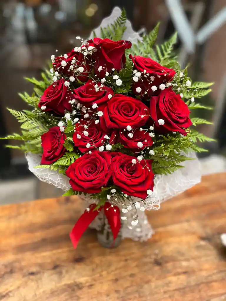 Hermoso ramo de 12 rosas ecuatorianas, acompañadas de un delicado follaje. Rosas de color Rojo ideal para el Amor