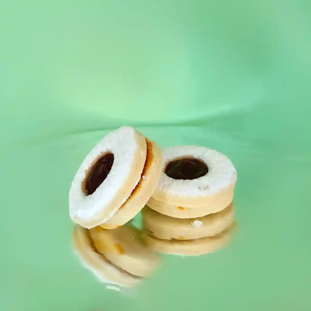 Alfajor de maicena, relleno de manjar y mermelada de frambuesa, espolvoreado con azúcar flor