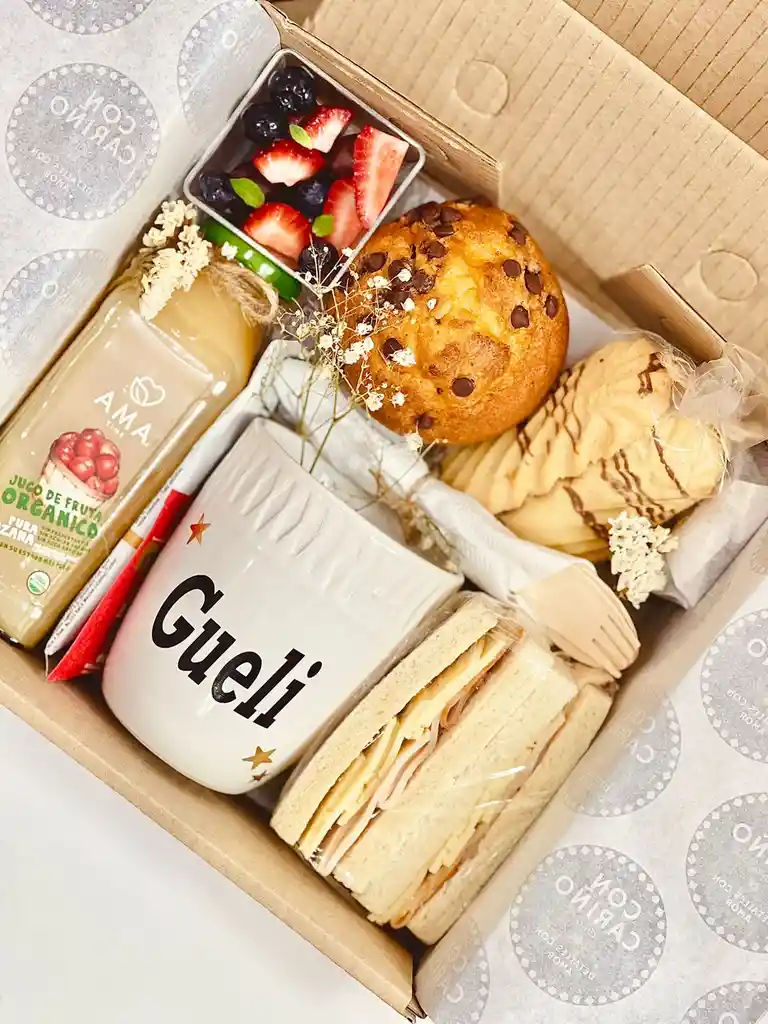Contenido: Caja Kraft Taza nombre Cubiertos Muffins Fruta pocillo Jugo Ama Galletas artesanales Café sobre Starbucks Te Twings Sándwich jamón/queso Alfajor artesanal Papel envoltorio Florcitas Tarjeta de envió Carta Pitilla cierre