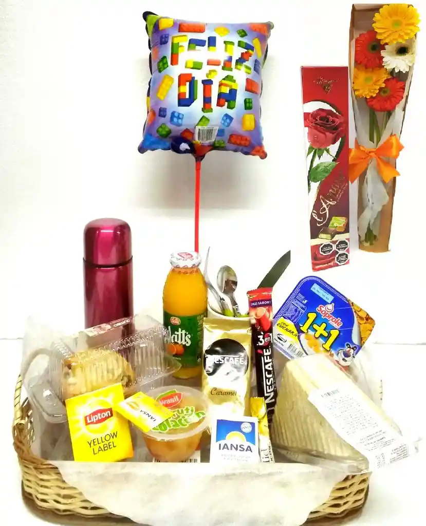 Este Clásico Desayuno, seguro una excelente alternativa para cualquier ocasión. La Bandeja incluye: Una Taza y un Termo Un Jugo de Naranja Un Muffin y un Sandwich pan miga Un Yogurt con cereal y una Porción de Frutas Sachet Café, Capuchino, Té varios sabores, azúcar y sacarina Servicio acero inoxidable, servilleta, Tarjeta con saludo. Globito de saludo (según motivo del mensaje) Todo envuelto en papel celofán y gran moño de cinta. Foto Referencial Más Hermosa Caja 5 Gerberas y Bombones de 116 gramos.